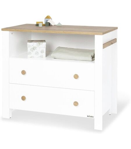 Die Wickelkommode Lova breit von Pinolino bereichert das Kinderzimmer im modernen Stil. Dank des abnehmbaren Wickelaufsatzes ist das Möbelstück auch als klassisches Sideboard verwendbar. Material: MDF, Dekor uni, weiß und Eiche mit Echtholzstruktur, Möbelknöpfe aus Massivholz Ausstattung: 2 Schubladen, 1 offenes Fach, 2 Handtuchstangen, abnehmbarer Wickelaufsatz Funktionen: Self-Soft-Close-System Maße: 102(B) x 76(T) x 99(H) cm, ohne Wickelaufsatz 102(B) x 58(T) x 99(H) cm, Wickelhöhe 90 cm, Belastbarkeit bis 15 kg Mit der Wickelkommode von Pinolino steht Dir ein durchdachter Platz für die Pflege Deines Kindes zur Verfügung. In einer Höhe von 90 Zentimetern kannst Du ihm bequem die Windeln oder die Kleidung wechseln. Sämtliche Utensilien, die Du dazu benötigst, finden in dem offenen Fach oder einer der sanft und sicher schließenden Schubladen Platz. Handtücher und ähnliches kannst Du an den seitlichen Stangen aufhängen. Praktisch: Der Wickelaufsatz kann wahlweise links, rechts oder mittig montiert werden. Bei Bedarf kannst Du auch komplett auf ihn verzichten und die Kommode als klassisches Sideboard verwenden. ...