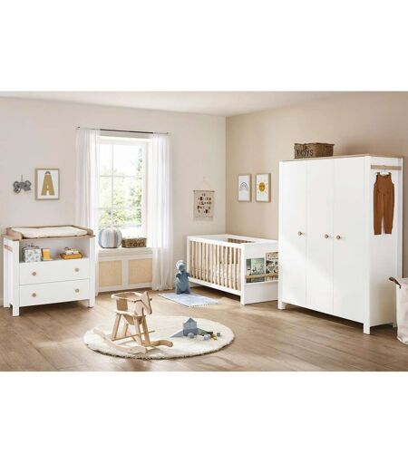 Mit dem dreiteiligen Babyzimmer Lova breit von Pinolino verwandelt sich das Kinderzimmer im Nu in ein liebevoll eingerichtetes Zuhause für Dein Kleines: Das Trio besteht aus einem Kombi-Kinderbett, einer Wickelkommode und einem Kleiderschrank. Für eine moderne Optik setzen alle Möbel auf ein unifarbenes weißes Dekor und Akzente in Eichen-Optik. Kombi-Kinderbett Lova Lieferumfang: Kombi-Kinderbett Lova mit 3 Schlupfsprossen und 4-fach höhenverstellbarem Lattenrost (16,20, 32 und 47 cm), Umbauseiten Material: MDF, Dekor uni, weiß und Eiche mit Echtholzstruktur Verwendung: Babybett (0-3 Jahre), Juniorbett (3-6 Jahre), Kindersofa Belastbarkeit: bis 35 kg Maße: 150(L) x 79(B) x 81(H) cm, Liegefläche 140 x 70 cm Das Kombi-Kinderbett Lova bietet Deinem Mini einen sicheren Platz zum Träumen, Schlafen und Entspannen. Dein Kind kann es sich auf der 140 mal 70 Zentimeter großen Liegefläche bequem machen. Sie ist vierfach in der Höhe verstellbar, sodass sich das Ablegen und Herausheben so entspannt wie möglich gestaltet. Sobald Dein Kleines selbstständig ins Bett hinein- und wieder herauskrabbeln kann, hast Du die Möglichkeit, drei Schlupfsprossen zu entfernen. Für ältere Kids lässt sich das Bett auch in eine Junior-Variante oder ein Kindersofa verwandeln. Cooles Extra: Solange das Kombi-Bett Lova als Babybett oder Kindersofa verwendet wird, punktet es mit einem praktischen Bilderbuchregal am Fußende. Wickelkommode Lova breit Material: MDF, Dekor uni, weiß und Eiche mit Echtholzstruktur, Möbelknöpfe aus Massivholz Ausstattung: 2 Schubladen, 1 offenes Fach, 2 Handtuchstangen, abnehmbarer Wickelaufsatz Funktionen: Self-Soft-Close-System Maße: 102(B) x 76(T) x 99(H) cm, ohne Wickelaufsatz 102(B) x 58(T) x 99(H) cm, Wickelhöhe 90 cm, Belastbarkeit bis 15 kg Die Wickelkommode des Sets überzeugt als praktischer Ort für die Pflege Deines Babys. Der dreiseitige Aufsatz bietet Deinem Kleinen einen sicheren Platz. Sämtliche Utensilien, die Du zum Windelnwechseln und Waschen des Kindes benötigst, lassen sich praktisch und in greifbarer Nähe verstauen. Neben einem offenen Fach stehen Dir zwei sanft und leise schließende Schubladen sowie zwei seitliche Handtuchstangen zur Verfügung. Praktisch: Ist Dein Kind dem Windelalter entwachsen, kannst Du den Aufsatz einfach abnehmen und Spielzeuge oder Kleidung in der Kommode unterbringen. Kleiderschrank Lova breit Material: MDF, Dekor uni, weiß und Eiche mit Echtholzstrukturm Möbelknöpfe aus Massivholz Ausstattung: 3 Schranktüren, 4 schmale, 2 breite, teilweise verstellbare Einlegeböden, 1 Kleiderstange innen, 2 Kleiderstangen außen Funktionen: Soft-Close-System Maße: 146(B) x 54(T) x 190(H) cm Komplett wird das Möbel-Set mit dem dreitürigen Kleiderschrank Lova breit. Mit seinen vier schmalen und zwei breiten Einlegeböden sowie einer Kleiderstange bringt er Ordnung in die Garderobe Deines Kindes. Einzelne Outfits finden an den beiden seitlichen Kleiderstangen Platz. ...