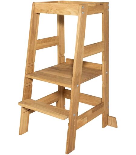 Der aus geölter Eiche gefertigte Lernturm Fino von Pinolino bietet Deinem kleinen Entdecker einen sicheren Platz auf Augenhöhe mit den Erwachsenen. Dein Mini kann sich aktiv an verschiedenen Haushaltstätigkeiten beteiligen oder zuschauen und lernen. Lieferumfang: Lernturm Fino Material: massive Eiche, geölt mit Natur-Hartöl Verwendung: Küchenhelfer oder Entdeckerturm, umbaubar zum Tritthocker Belastbarkeit: bis 60 kg Maße: 54(B) x 47(T) x 85(H) cm, 3-fach verstellbare Trittfläche (32, 39 und 45 cm), 3-fach verstellbare Trittstufe (16, 19 und 22 cm) geeignet für: Kinder ab dem Stehalter Der Lernturm Fino von Pinolino unterstützt die Entwicklung Deines Kindes als Küchenhelfer oder Entdeckerturm. Er lässt sich dank einer dreifach höhenverstellbaren Trittstufe und einer ebenfalls dreifach verstellbaren Trittfläche jederzeit auf die Größe Deines Minis abstimmen. So befindet sich Dein Kind stets in einer optimalen Höhe, um Dir bei Deinen Tätigkeiten zuzuschauen oder zu helfen. Der Rundum-Rausfallschutz bietet Deinem Kleinen Sicherheit. Seitliche Stützen schützen den Turm davor umzukippen. Praktisch: Du kannst den rückwärtigen Rausfallschutz bei Bedarf einfach abnehmen. So wird aus dem Lernturm ein praktischer Tritthocker, der sich für Kinder mit einem Maximalgewicht bis 60 Kilogramm eignet. Garantie-Hinweis Informationen zu den Garantie-Bedingungen erhältst Du hier. ...