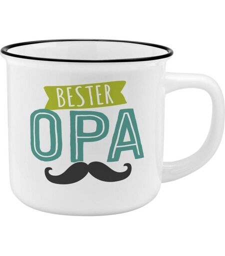 Schöner Kaffeebecher aus New Bone China Porzellan in ansprechender Emailleoptik. Becher mit Motivdruck 'Bester Opa', Volumen ca. 35 cl. Kultige Tasse mit dekorativer Geschenk-Banderole. Der hochwertige Kaffeebecher ist als New Bone China Porzellan hergestellt und daher pflegeleicht und robust. Optisch wirkt der Becher aufgrund seiner Form wie ein Emaille-Becher. Der schöne Becher fasst etwa 35 cl und ist somit wunderbar geeignet für eine Tasse Kaffee oder Tee. Dank der dekorativen Geschenkbanderole eignet sich der Trinkbecher außerdem gut als Geschenk oder kleine Aufmerksamkeit, zum Beispiel zum Geburtstag, zu Weihnachten oder zum Valentinstag. Am besten wirkt der Becher natürlich in Kombination mit einem oder mehreren der weiteren verfügbaren Motive. ...