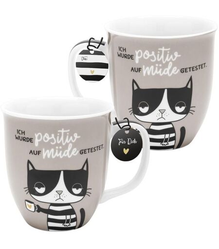 "H:)ppy life Tasse 47925 mit Motivdruck: ""Ich wurde positiv auf müde getestet"", mit Geschenktag, mit Henkeldruck, mit Golddruck. Kaffeetasse aus Porzellan, Durchmesser 9 cm, Höhe 10 cm, Volumen 40 cl. Tasse mit Katzen-Motiv und Spruch ""Ich wurde positiv auf müde getestet"". Die Porzellan-Tasse überzeugt mit einem niedlichen Motivdruck und einem liebevollen Spruch. Ausgestattet mit einem Geschenk-Anhänger eignet sich die Kaffeetasse zudem gut als kleine Aufmerksamkeit für einen lieben Menschen, sei es zum Valentinstag, zum Geburtstag oder zu einer anderen Gelegenheit." ...