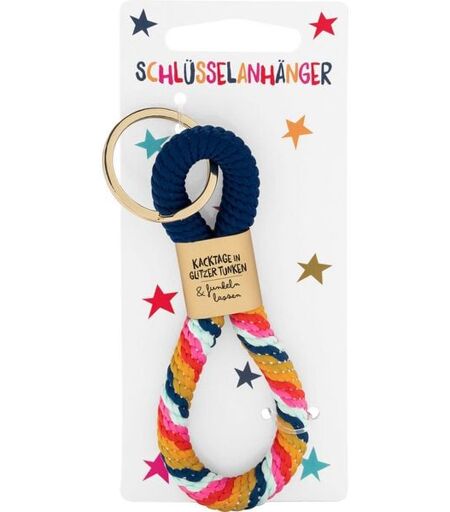 Schlüsselanhänger bestehend aus einer bunten, geflochtenen Schlaufe inkl. goldenem Metallelement mit Gravur: 'Kacktage in Glitzer tunken & funkeln lassen', auf Headercard ...