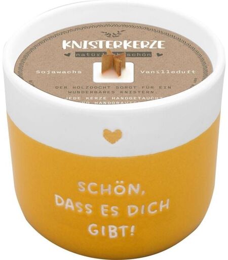 "DEKORIEREN MIT STIL: Schöne Kerzen, Vasen, Glaskugeln, Schalen, Windlichter, Schneekugeln und stylische Accessoires in farbigem Design und mit liebevollem Text sorgen für frischen Wind in einer schönen Wohnung :-) Die Kerze im Becher mit Gravur eignet sich als Dekoartikel und als kleines Geschenk. KERZE MIT GRAVUR: Duftkerze mit graviertem Spruch "" Schön, dass es dich gibt!"", natürlich schöne Kerze in Steinzeug-Becher mit matter Optik, mit Holzdocht, der beim Brennen knistert, Sojawachs mit Vanilleduft, Brenndauer 25 Stunden. VOLL IM TREND: Egal ob Lama, Faultier oder trendige Sprüche, Farben, Formen und Material für einen natürlichen, nachhaltigen Look - wir sorgen dafür, dass die brandaktuellen Trends zuhause, bei Familie, Freunden und den Kollegen landen. IDEALE GESCHENKIDEE: Passend für jeden Anlass als Geschenk, zum Beispiel zum Valentinstag, zum Jahrestag, zum Geburtstag oder einfach so als schönes Mitbringsel. Als Präsent für die Freundin, den Freund, Mama, Papa, Partner, für Sie, für Ihn und auch alle anderen Lieblingsmenschen geeignet." ...
