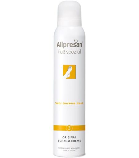 Allpresan Fuß spezial Nr. 3 Schaum-CremeDie Allpresan Fuß spezial Nr. 3 Schaum-Creme mit 10 % Urea spendet intesiv und langanhaltend Feuchtigkeit und reduziert Hautrauigkeit, -rissigkeit und Verhornungen. Sie ist speziell für sehr trockene Haut am Fuß entwickelt worden. Diese Schaum-Creme bietet eine intensive Pflege und hilft, die Haut weich und geschmeidig zu halten. Die neue, verbesserte Rezeptur enthält biomimetische (hautverwandte) Lipide, die die Hautbarriere stärken und die Hautregeneration unterstützen. Die leichte Schaumtextur zieht schnell ein, ohne ein fettiges Gefühl zu hinterlassen, und hinterlässt die Haut intensiv gepflegt und geschützt. Sehr trockene FußhautSehr trockene Fußhaut ist gekennzeichnet durch Hautrauigkeit, Risse und Verhornungen und bietet dadurch eine perfekte Eintrittspforte für Bakterien und andere Mikroorganismen, die u.a. zu Entzündungen und Pilzinfektionen führen können. Sehr trockene Haut ist daher kein rein kosmetisches Problem. Die perfekte Pflege bietet unser Schaum-Creme Klassiker, die Allpresan Fuß spezial Nr. 3 für sehr trockene Haut – jetzt mit verbesserter Rezeptur mit biomimetischen (hautverwandten) Lipiden. Speziell entwickelt zur täglichen Pflege sehr trockener Fußhaut, spendet die Schaum-Creme mit 10 % Urea intensiv Feuchtigkeit und reduziert zugleich Hautrauigkeit, -rissigkeit und Verhornungen.Durch die regelmäßige Anwendung der Allpresan Fuß spezial Nr. 3 Schaum-Creme wird die Haut intensiv und langanhaltend mit Feuchtigkeit versorgt. Die Haut wird weicher, glatter und widerstandsfähiger gegenüber äußeren Einflüssen und das Risiko für mögliche Infektionen auf diese Weise verringert.Modo d'usoIdealerweise sollte die Allpresan Fuß spezial Nr. 3 Schaum-Creme 2 x täglich (morgens und abends) bzw. nach Bedarf auf die trockenen Hautpartien aufgetragen werden, um die Haut an den Füßen optimal zu pflegen. Dank der Allpresan Schaum-Creme Technologie ist diese besonders ergiebig – eine kleine Menge genügt bereits für größere Hautpartien. Die Allpresan Fuß spezial Nr. 3 Schaum-Creme zieht schnell ein und fettet nicht, sodass Kleidung direkt wieder angezogen werden kann. Das Produkt ist nur zur äußeren Anwendung geeignet. Bitte schütteln Sie die Schaum-Creme Dose vor Gebrauch gut und halten Sie sie bei Entnahme aufrecht. Vor dem ersten Gebrauch sollten Sie das Originalitätssiegel auf der Rückseite des Schaumkopfes entriegeln.IngredientiAqua, Urea, Butane, Decyl Oleate, Octyldodecanol, Glycerin, Cetearyl Alcohol, Propane, Stearic Acid, Glyceryl Stearate, Olea Europaea Fruit Oil, Caprylyl Glycol, Sodium Lauroyl Sarcosinate, Capryloyl Glycine, Caprylic/Capric Triglyceride, Butyrospermum Parkii Butter, Potassium Lauroyl Wheat Amino Acids, Allantoin, Palm Glycerides, Hydrogenated Lecithin, Ceramide NP, Squalane, Pentylene Glycol, Hydrogenated Palm Glycerides Citrate, Tocopherol. ...