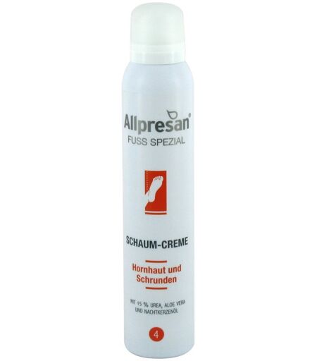 Aqua, Urea, Decyl Oleate, Octyldodecanol, Butane, Cetearyl Alcohol, Propane, Stearic Acid, Propylene Glycol, Glycerin, Glyceryl Stearate, Oenothera Biennis Oil, Aloe Barbadensis Extract, Allantoin, Sorbitol, Potassium Lauroyl Wheat Amino Acids, Palm Glycerides, Capryloyl Glycine, Sodium Lauroyl Sarcosinate.GegenanzeigenBei bekannter Überempfindlichkeit gegenüber einem der oben genannten Inhaltsstoffe sollte dieses Produkt nicht angewendet werden.DosierungAnwendungsempfehlung von Allpresan Fuss spezial Nummer 4 Hornhaut und Schrunden:
