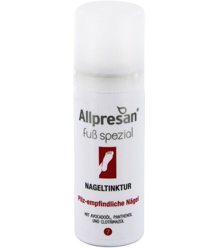 Anwendungsgebiet von Allpresan Fuss spezial Nummer 7 NageltinkturAllpresan Fuss spezial Nummer 7 Nageltinktur ist eine intensive Pflege für raue und strapazierte Fußnägel.Wirkungsweise von Allpresan Fuss spezial Nummer 7 NageltinkturMit Allpresan Fuss spezial Nummer 7 Nageltinktur können Sie die Widerstandskraft Ihrer Fußnägel erhöhen und sie so vor schädlichen Einflüssen und, durch das enthaltene Clotrimazol, vor Nagelpilz schützen. Zudem pflegt Allpresan Fuss spezial Nummer 7 Nageltinktur sie intensiv mit Avocadoöl und Panthenol. Diese beiden Stoffe spenden Ihren Nägeln intensive Feuchtigkeit und wirken beruhigend. Dabei ist Allpresan Fuss spezial Nummer 7 Nageltinktur auch für Diabetiker geeignet, frei von Konservierungs- und Farbstoffen und dermatologisch getestet.Wirkstoffe / Inhaltsstoffe / ZutatenInhaltsstoffe von Allpresan Fuss spezial Nummer 7 Nageltinktur: