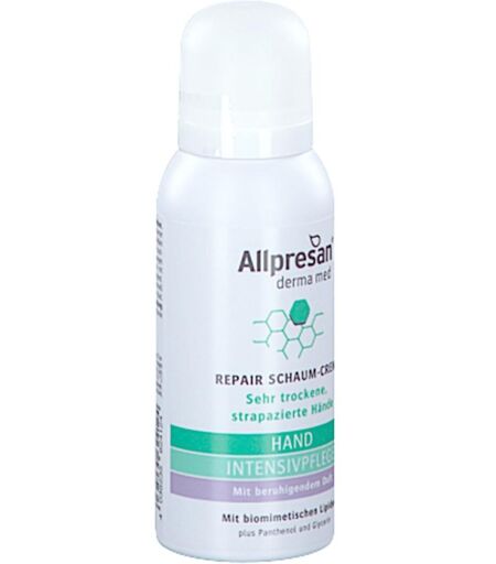 Anwendungsgebiet von Allpresan Derma Med Hand Intensivpflege mit DuftAllpresan Derma Med Hand Intensivpflege mit Duft ist eine medizinische Hand-Intensivpflege mit biomimetischen (hautverwandten) Lipiden, Panthenol, Glycerin und beruhigendem Duft. Sie versorgt die sehr trockene, strapazierte Haut an den Händen intensiv mit Lipiden und Feuchtigkeit.Wirkstoffe / Inhaltsstoffe / ZutatenInhaltsstoffe von Allpresan Derma Med Hand Intensivpflege mit Duft : Aqua, Octyldodecanol, Decyl Oleate, Butane, Glycerin, Panthenol, Cetyl Alcohol, Propane, Stearic Acid, Glyceryl Stearate, Caprylic/Capric Triglyceride, Hydrogenated Lecithin, Sorbitol, Caprylyl Glycol, Palm Glycerides, Sodium Lauroyl Sarcosinate, Butyrospermum Parkii Butter, Pentylene Glycol, Capryloyl Glycine, Potassium Lauroyl Wheat Amino Acids, Parfum, Squalane, Allantoin, Citric Acid, Ceramide NP, Tocopherol, Hydrogenated Palm Glycerides Citrate, Limonene, Hexyl Cinnamal, Alpha-Isomethyl Ionone, Citronellol, Hydroxycitronellal, Linalool, Geraniol, Benzyl Alcohol, Benzyl Salicylate.GegenanzeigenBei bekannter Überempfindlichkeit gegen einzelne Inhaltsstoffe sollte Allpresan Derma Med Hand Intensivpflege mit Duft nicht angewendet werden.DosierungAnwendungsempfehlung von Allpresan Derma Med Hand Intensivpflege mit Duft: Möglichst nach jeder Handreinigung bzw. nach Bedarf anwenden, um die Hände optimal zu pflegen. Die Allpresan Derma Med Hand Intensivpflege mit Duft ist besonders ergiebig, eine walnussgroße Menge genügt. Allpresan Derma Med Hand Intensivpflege mit Duft können in Ihrer Versandapotheke www.apotheke.at erworben werden. ...