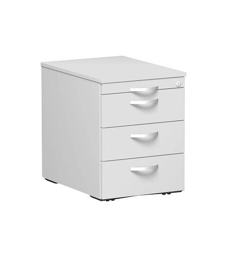 geramöbel Flex Rollcontainer lichtgrau 4 Auszüge 43,0 x 60,0 x 56,5 cm – die flexible Stauraum-LösungDer geramöbel Flex Rollcontainer lichtgrau 4 Auszüge 43,0 x 60,0 x 56,5 cm vereint Mobilität, Funktionalität und Design. Durch seine zeitlose Erscheinung fügt er sich wunderbar in Ihren Büroraum ein und sorgt dafür, dass Sie Ihre Unterlagen, Notizen und andere Utensilien immer schnell zur Hand haben. Dank der leichtgängigen Rollen sind Sie flexibel und können immer neu wählen, wo Sie ihn einsetzen möchten.Informatives zur MaterialartDas Material Holz, aus dem der Korpus gefertigt wurde, ist sehr robust und verspricht langanhaltende Freude mit diesem Möbelteil. Die Melaminharzbeschichtung macht dieses Produkt widerstandsfähig gegen Stöße, Hitze und Feuchtigkeit und ist zudem pflegeleicht. Der Korpus und die Schubladen haben die Farbe Lichtgrau, die sich perfekt in Ihre Büroeinrichtung integrieren lässt.Welches Design und Material haben die Griffe?Die Bogengriffe sind hier ein schönes Detail und das Möbelstück wirkt damit hochwertig und edel. Die Griffe sind aus robustem Metall gefertigt.Alles zur SchubladenbeschaffenheitFolgende Aufteilung bietet das Modell: 4 Auszüge, das heißt 1 Utensilienauszug und 3 Schubladen. So erhalten Sie viel Möglichkeiten mit System zur Ablage Ihrer Geschäftspapiere. Das Material, aus dem die Schübe gefertigt sind, ist Spanplatte. Die Schubladen sind mit einer Auszugssperre ausgestattet, die dazu beiträgt, dass sie nicht zu weit herausgezogen werden. Auch das gleichzeitige Öffnen von zwei Schubladen ist dadurch nicht möglich. Mit einer Auszugsöffnung von bis zu 75% können Sie die Schübe optimal nutzen.So wird abgeschlossenDie zentrale Verriegelung dieses Möbelelements ist ein großer Vorteil, wenn Sie Ihre Dokumente vor unbefugter Einsicht schützen möchten.Schauen Sie gleich, ob die folgenden Kriterien passen!Damit Sie das Möbelstück uneingeschränkt nutzen können, beachten Sie folgende Maße: Breite: 43,0 cmTiefe: 60,0 cmHöhe: 56,5 cmBeachten Sie auch das Gesamtgewicht des Produkts – es wiegt 27,0 kg. Gut zu wissen: Es handelt sich hier um ein Produkt "Made in Germany", das eine hohe Qualität und lange Lebensdauer verspricht.Wie wäre es mit zusätzlichen Elementen zum Kombinieren aus dieser Serie?Hier im Shop finden Sie noch weitere Produkte der Serie Flex, um Ihre Einrichtung mit passenden Elementen zu kombinieren. Denn ob im Großraumbüro oder im Home-Office – in einem schönen Ambiente macht das Arbeiten gleich mehr Spaß.Entspricht dieses flexible Büromöbelelement Ihren Anforderungen?Dann bestellen Sie den geramöbel Flex Rollcontainer lichtgrau 4 Auszüge 43,0 x 60,0 x 56,5 cm gleich hier bei uns online! ...