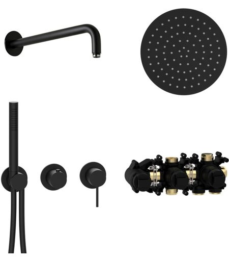 "herzbach MODUL7 Hebelmischert-Set H-RB250 mit Regenbrause und Stabhandbrause zum Einsatz im Duschbereich SET-UMFANG 70.720002.1.09 MODUL7 Hebelmischer-Einbaukörper 70.702002.1.12 MODUL7 Hebelmischer-Farbset für 2 Verbraucher 23.960350.1.12 LIVING SPA Wandarm 350 mm, Ø 70 mm 23.600250.1.12 LIVING SPA Slim-Regenbrause Ø 250 mm MODUL7 Hebelmischer-Einbaukörper -für 2 Verbraucher MODUL7 Hebelmischer -leichtgänige LOGIC-SoftEmotion Keramikkartusche -stufenlose Mengen- und Temperaturregulierung -Messing Bediengriff -Messing Modulblende Ø 70 mm MODUL7 Ab- und Umstellventil -keramischer 2 Wege-Umsteller -leichtgängige und stufenlose Mengenregulierung mit geringem Bedienradius -komfortabel getrennte Verbraucherwahl durch haptischen Rastpunkt -Messing Bediengriff -Messing Modulblende Ø 70 mm MODUL7 Brausehalterset -Brauseanschlussbogen mit verdecktem Schlauchanschluss -MODUL7 Brauseschlauch 1500 mm mit Drehkonus -1-strahlige Messing-Stabhandbrause -Messing Modulblende Ø 70 mm LIVING SPA Wandarm -Ausladung 350 mm -Formgebung rund abgewinkelt -1/2"" Anschlussgewinde -Messing-Blende Ø 70 mm LIVING SPA Slim-Regenbrause -Durchmesser Ø 250 mm -Clean-Effect Modul-Mittenabstand 105 mm min. Betriebsdruck: 0,5 bar max. Betriebsdruck: 5 bar integrierte Rückflussverhinderer und Schmutzfangsiebe eigensicher gegen Rückfließen Oberfläche Schwarz matt Hersteller herzbach / Warengruppe M7 SETS BLACK Art-Nr. 70.702712.1.12" ...