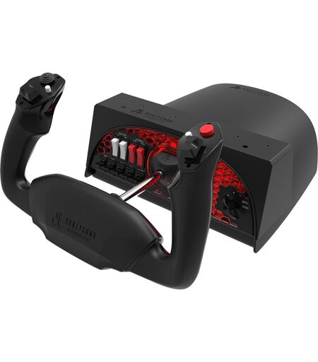 Honeycomb Aeronauticals Alpha Flight Controls ist eines der fortschrittlichsten Steuerhörner, das gegenwärtig für die Flugsimulation am PC zur Verfügung steht. Es wurde konzipiert, um den Anforderungen von Flugsimulator-Nutzern, aber auch von Flugschülern und Piloten zu entsprechen. Alle internen Komponenten sind in Luftfahrtqualität gefertigt und bieten mit einer realistischen Ergonomie ein wirklichkeitsgetreues Flugerlebnis. Die hochwertige Mechanik bietet für die Querrudersteuerung einen realistischen vollen 180°-Drehwinkel mit einem selbstzentrierenden Mechanismus ohne Deadzone. In Längsrichtung erlaubt die Stahlwelle einen Bewegungsraum von 15 cm. Der Mechanismus ist vollständig aus Metall gefertigt und gewährleistet so eine lange Haltbarkeit. Das Yoke verfügt über ein Schalter-Panel mit Batterie- und Alternator-Schalter, AvionikHauptschalter sowie Lichtschaltern. Es ist mit einer roten LED-Hintergrundbeleuchtung ausgestattet, sodass es auch nachts gut bedienbar ist. Ebenfalls vorhanden ist ein Zündschalter, wie er bei Kolbenmotorflugzeugen üblich ist. Am linken Griff befinden sich zwei Tasten, zwei 2-Wege-Hat-Switches und eine Push-toTalk-Taste, während der rechte Griff über zwei weitere 2-Wege Hat-Switches, einen 8-Wege-Rundblickschalter sowie eine Taste verfügt. ...