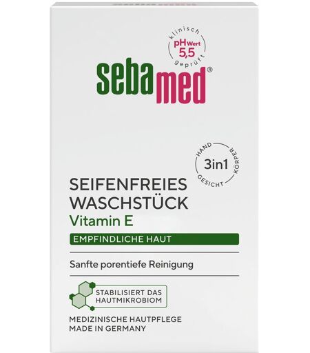 Sebamed seifenfreies Waschstück 150 g mit Vitamin E, für die tägliche sanfte, porentiefe Reinigung empfindlicher Haut, zur Hand-, Gesichts- und Körperreinigung geeignetWERTVOLLE INHALTSSTOFFE: Extra-milde und pflegende Reinigung durch die Kombinationhautschonender Waschstoffe. Mit einem Pflegekomplex auf Basis Vitamin E und Panthenolsorgt das sebamed Seifenfreie Waschstück für Sauberkeit, Frische und spürbar entspannte,geschmeidige HautFÜR GESUNDE HAUT: Der pH-Wert 5,5 von sebamed stärkt die Funktion des natürlichenHautschutzmantels auch gegen schädliche Umwelteinflüsse und trägt zur Gesunderhaltungder Haut beiSTABLISIERT DAS HAUTMIKROBIOM: Die Mikroorganismen der Haut leben in einem guteingespielten ökologischen Gleichgewicht. Sebamed Produkte mit ihren schonendenRezepturen, milden Inhaltsstoffen und dem pH-Wert 5,5 helfen, die Artenvielfalt und Vitalitätdieses hauteigenen Ökosystems auf natürliche Weise zu erhalten und zu stabilisierenQUALITÄT MADE IN GERMANY: Unsere Produkte werden in Deutschland entwickelt,getestet und hergestellt. Die Qualität ist durch ausgewählte Rohstoffe und kontrollierteFertigungsprozesse garantiert. Sebamed Produkte sind in über 400 Studien dermatologisch-klinisch getestetDERMATOLOGISCH-KLINISCH BESTÄTIGT: Unsere Produktserie für empfindliche Haut hilft,den natürlichen Hautschutzmantel zu stabilisieren und die Haut widerstandsfähiger gegenUmweltreize zu machen. Die Verträglichkeit und Pflegewirkung sind dermatologisch-klinischgeprüft und bestätigt. Dadurch trägt diese Pflegeserie nachweislich dazu bei, das Risiko fürHautreaktionen spürbar zu vermindernUNSER UMWELTVERSPRECHEN: 0 % Mikroplastik 0 % Silikone 0 % PEG, VEGANAnwendung:Waschstück anfeuchten, auf der nassen Haut auftragen und einmassieren, abspülen.Waschstück nach Gebrauch gut trocknen lassenInhaltsstoffe:Disodium Lauryl Sulfosuccinate, Stearic Acid, Palmitic Acid, Cetearyl Alcohol, Aqua, Talc, LacticAcid, Lecithin, Cocamidopropyl Betaine, Inulin, Panthenol, Parfum, Sodium Cocoyl Glutamate,Phytic Acid, CI 77891, Tocopheryl Acetate, Glycine, Citric Acid, Magnesium Aspartate, Alanine,Sodium Sulfate, Lysine HCl, Leucine, CI 47005, CI 61570 ...