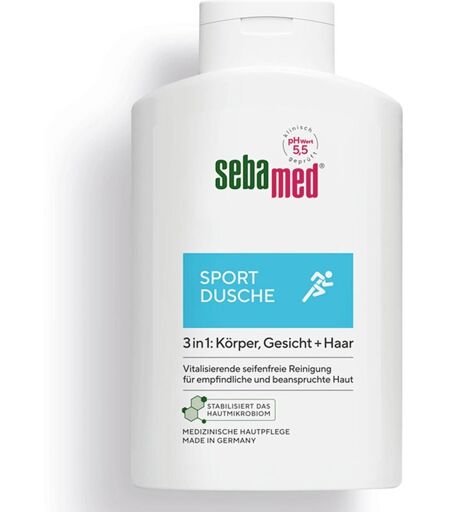 Pflege. Von Dermatologen für sportstrapazierte Haut empfohlen.REINIGT HAUT & HAAR: Nach dem Sport braucht empfindliche, strapazierte Haut und Kopfhaut besondere Pflege. Von Dermatologen für sportstrapazierte Haut empfohlen. Sebamed Sportdusche 3 in 1 für Gesicht, Körper und Haar reinigt Haut und Haar schonend, pflegt Haar und Kopfhaut intensiv und erfrischt und vitalisiert. Auch bei intensivem Training und häufigem Duschen bleibt die Haut spürbar gepflegt.PH 5,5 FÜR GESUNDE HAUT: Der pH-Wert 5,5 von sebamed stärkt die Funktion des natürlichen Hautschutzmantels auch gegen schädliche Umwelteinflüsse und trägt zur Gesunderhaltung der Haut bei.STABILISIERT DAS HAUTMIKROBIOM: Die Mikroorganismen der Haut leben in einem gut eingespielten ökologischen Gleichgewicht. Sebamed Produkte mit ihren schonenden Rezepturen, milden Inhaltsstoffen und dem pH-Wert 5,5 helfen, die Artenvielfalt und Vitalität dieses hauteigenen Ökosystems auf natürliche Weise zu erhalten und zu stabilisieren.QUALITÄT MADE IN GERMANY: Unsere Produkte werden in Deutschland entwickelt, getestet und hergestellt. Die Qualität ist durch ausgewählte Rohstoffe und kontrollierte Fertigungsprozesse garantiert. Sebamed Produkte sind in über 400 Studien dermatologisch-klinisch getestet.DERMATOLOGISCH-KLINISCH BESTÄTIGT: Sebamed Produkte helfen, den natürlichen Hautschutzmantel zu stabilisieren und die Haut widerstandsfähiger gegen Umweltreize zu machen. Die Verträglichkeit und Pflegewirkung sind dermatologischklinisch geprüft und bestätigt. Dadurch trägt diese Pflegeserie nachweislich dazu bei, das Risiko für Hautreaktionen spürbar zu vermindern.UNSER UMWELTVERSPRECHEN: 0 % Mikroplastik 0 % Silikone, 0% PEG, VeganWirkungsweise von Sebamed Sp ...
