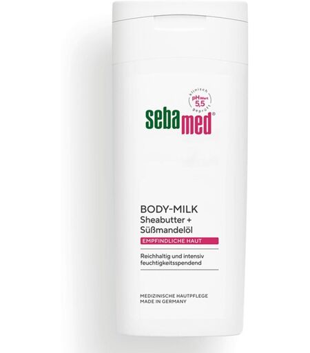 Anwendungsgebiet von Sebamed Body MilkSebamed Body Milk - mit Sheabutter und Süßmandelöl, reichhaltig und intensiv feuchtigkeitsspendend, für empfindliche und trockene Haut, mehr Glätte und Geschmeidigkeit FÜR TROCKENE UND EMPFINDLICHE HAUT: sebamed Body-Milk ist speziell auf die Bedürfnisse empfindlicher, zu Trockenheit neigender oder anspruchsvoller Haut abgestimmt. Die reichhaltige O/W-Emulsion enthält hochwertige pflanzliche Öle wie Süßmandelöl und Sheabutter sowie feuchtigkeitsspendende Wirkstoffe und Panthenol (Provitamin B5). Sie schützt die Haut und fördert ihre Glätte, Geschmeidigkeit und Regeneration.PH 5,5 FÜR GESUNDE HAUT: Der pH-Wert 5,5 von sebamed stärkt die Funktion des natürlichen Hautschutzmantels auch gegen schädliche Umwelteinflüsse und trägt zur Gesunderhaltung der Haut bei.QUALITÄT MADE IN GERMANY: Unsere Produkte werden in Deutschland entwickelt, getestet und hergestellt. Die Qualität ist durch ausgewählte Rohstoffe und kontrollierte Fertigungsprozesse garantiert. Sebamed Produkte sind in über 400 Studien dermatologisch-klinisch getestet.DERMATOLOGISCH-KLINISCH BESTÄTIGT: Sebamed Produkte helfen, den natürlichen Hautschutzmantel zu stabilisieren und die Haut widerstandsfähiger gegen Umweltreize zu machen. Die Verträglichkeit und Pflegewirkung sind dermatologischklinisch geprüft und bestätigt. Dadurch trägt diese Pflegeserie nachweislich dazu bei, das Risiko für Hautreaktionen spürbar zu vermindern.UNSER UMWELTVERSPRECHEN: 0 % Mikroplastik 0 % Silikone, 0% PEG, VeganWirkungsweise von Sebamed Body MilkDie Sebamed Body Milk enthält eine spezielle Öl-Wasser-Emulsion mit reichhaltigen, pflanzlichen Ölen: Süßmandelöl und Sheabutter bestehen aus hautverwandten Lipiden, die sich wie eine Schutzschicht auf die Haut legen und langanhaltende Feuchtigkeit spenden. Auch der pH-Wert von 5,5 unterstützt den natürlichen Säureschutzmantel der Haut, um äußeren Reizungen entgegengewi ...
