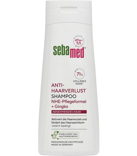 Anwendungsgebiet von Sebamed Anti-haarverlust ShampooSebamed Anti-haarverlust Shampoo - Shampoo gegen Haarausfall, für kräftiges und gesundes Haar, fördert das Wachstum und aktiviert die Haarwurzel, bis zu 71% volleres Haar* *Anwendungsstudie über 6 Monate, Lab Analysis Life Science 2024GEGEN HAARVERLUST: Die regelmäßige Verwendung des Shampoos fördert das Wachstum von gesundem Haar, stärkt die Widerstandskraft des Haars, aktiviert die Haarwurzel und wirkt erblich bedingtem Haarverlust entgegen.WERTVOLLE INHALTSSTOFFE: Die Wirksamkeit von Sebamed Anti-haarverlust Shampoo beruht auf der NHE-Pflegeformel mit Coffein und Ginkgo biloba, welche die Durchblutung in der Kopfhaut anregt. Die verbesserte Durchblutung bietet optimale Wachstumsbedingungen für kräftiges und gesundes Haar.FÜR GESUNDE HAUT: Der pH-Wert 5,5 von sebamed stärkt die Funktion des natürlichen Hautschutzmantels auch gegen schädliche Umwelteinflüsse und trägt zur Gesunderhaltung der Haut bei.STABLISIERT DAS HAUTMIKROBIOM: Die Mikroorganismen der Haut leben in einem gut eingespielten ökologischen Gleichgewicht. Sebamed Produkte mit ihren schonenden Rezepturen, milden Inhaltsstoffen und dem pH-Wert 5,5 helfen, die Artenvielfalt und Vitalität dieses hauteigenen Ökosystems auf natürliche Weise zu erhalten und zu stabilisieren.QUALITÄT MADE IN GERMANY: Unsere Produkte werden in Deutschland entwickelt, getestet und hergestellt. Die Qualität ist durch ausgewählte Rohstoffe und kontrollierte Fertigungsprozesse garantiert. Sebamed Produkte sind in über 400 Studien dermatologisch-klinisch getestet. 0% Mikroplastik, 0% Silikone.DERMATOLOGISCH-KLINISCH BESTÄTIGT: Sebamed Produkte helfen, den natürlichen Hautschutzmantel zu stabilisieren und die Haut widerstandsfähiger gegen Umweltreize zu machen. Die Verträglichkeit und Pflegewirkung sind dermatologischklinisch geprüft und bestätigt. Dadurch trägt diese Pflegeserie nachweislich dazu bei, ...