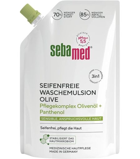 Anwendungsgebiet von Sebamed Oliven Waschemulsion NachfüllbeutelSebamed Oliven Waschemulsion Nachfüllbeutel ist ideal geeignet für die tägliche, seifenfreie Reinigung anspruchsvoller Haut.Pflegekomplex mit Olivenöl und Panthenol, seifenfreie Reinigung und Hautpflege für sensible und anspruchsvolle Haut, zur Hand-, Gesichts- und Körperreinigung geeignetMILDE REINIGUNG: Die extra-milde, seifenfreie Reinigungsformel pflegt sensitive Haut schon bei der Reinigung, gleicht Feuchtigkeitsverlust aus und erhält das Hautmikrobiom. Ein Pflegekomplex auf Basis von Olivenöl in Verbindung mit Panthenol und einem Wirkstoff aus pflanzlicher Stärke wirkt der Entfettung, Austrocknung und Reizung der Haut entgegen.GUT FÜR DIE UMWELT: 70% weniger Kunststoff und 85% weniger Abfallvolumen bezogen auf eine 400 ml Originalflasche bei vollständig entleerten und zusammengerollten Beutel.FÜR GESUNDE HAUT: Der pH-Wert 5,5 von sebamed stärkt die Funktion des natürlichen Hautschutzmantels auch gegen schädliche Umwelteinflüsse und trägt zur Gesunderhaltung der Haut bei.STABILISIERT DAS HAUTMIKROBIOM: Die Mikroorganismen der Haut leben in einem gut eingespielten ökologischen Gleichgewicht. Sebamed Produkte mit ihren schonenden Rezepturen, milden Inhaltsstoffen und dem pH-Wert 5,5 helfen, die Artenvielfalt und Vitalität dieses hauteigenen Ökosystems auf natürliche Weise zu erhalten und zu stabilisieren.QUALITÄT MADE IN GERMANY: Unsere Produkte werden in Deutschland entwickelt, getestet und hergestellt. Die Qualität ist durch ausgewählte Rohstoffe und kontrollierte Fertigungsprozesse garantiert. Sebamed Produkte sind in über 400 Studien dermatologisch-klinisch getestetDERMATOLOGISCH-KLINISCH BESTÄTIGT: Sebamed Produkte helfen, den natürlichen Hautschutzmantel zu stabilisieren und die Haut widerstandsfähiger gegen Umweltreize zu machen. Die Verträglichkeit und Pflegewirkung sind dermatologisch-klinisch geprüft und bestätigt. Da ...