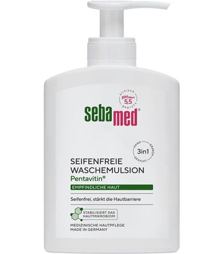 Anwendungsgebiet von Sebamed flüssig Waschemulsion mit SpenderSebamed flüssig Waschemulsion mit Spender ist eine seifenfreie Reinigung für empfindliche Haut. Sie stärkt die Hautbarriere und ist zur Hand-, Gesichts- und Körperreinigung geeignet.MILDE REINIGUNG: Ein Reinigungskomplex mit besonders milden Waschaktivsubstanzen reinigt die empfindliche Haut und hilft, die Haut vor Reizung und Austrocknung zu schützen. Ein Pflegekomplex mit Pentavitin und Panthenol gleicht Feuchtigkeitsverlust aus.HYGIENISCHER SPENDER: Ein Pump-Spender ermöglicht eine saubere und bequeme Möglichkeit, die sebamed Waschemulsion portionsgenau zu dosieren. Zur Hand-, Gesichts- und Körperreinigung geeignet.FÜR GESUNDE HAUT: Der pH-Wert 5,5 von sebamed stärkt die Funktion des natürlichen Hautschutzmantels auch gegen schädliche Umwelteinflüsse und trägt zur Gesunderhaltung der Haut bei.STABILISIERT DAS HAUTMIKROBIOM: Die Mikroorganismen der Haut leben in einem gut eingespielten ökologischen Gleichgewicht. Sebamed Produkte mit ihren schonenden Rezepturen, milden Inhaltsstoffen und dem pH-Wert 5,5 helfen, die Artenvielfalt und Vitalität dieses hauteigenen Ökosystems auf natürliche Weise zu erhalten und zu stabilisieren.QUALITÄT MADE IN GERMANY: Unsere Produkte werden in Deutschland entwickelt, getestet und hergestellt. Die Qualität ist durch ausgewählte Rohstoffe und kontrollierte Fertigungsprozesse garantiert. Sebamed Produkte sind in über 400 Studien dermatologisch-klinisch getestet.DERMATOLOGISCH-KLINISCH BESTÄTIGT: Sebamed Produkte helfen, den natürlichen Hautschutzmantel zu stabilisieren und die Haut widerstandsfähiger gegen Umweltreize zu machen. Die Verträglichkeit und Pflegewirkung sind dermatologischklinisch geprüft und bestätigt. Dadurch trägt diese Pflegeserie nachweislich dazu bei, das Risiko für Hautreaktionen spürbar zu vermindern.UNSER UMWELTVERSPRECHEN: 0 % Mikroplastik 0 % Silikone 0 % PEG, VEGANWirku ...