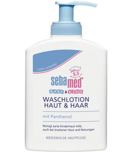 Anwendungsgebiet von Sebamed Baby & Kind Waschlotion Haut und HaarReinigt zarte Kinderhaut mild, auch bei trockener Haut und Reizungen.Wirkungsweise von Sebamed Baby & Kind Waschlotion Haut und HaarDem pH-Wert 5,5 kommt gerade in den ersten Lebensjahren eine wichtige Bedeutung zu. Er fördert den Aufbau des hauteigenen Hautschutzmantels gegen Austrocknung, Reizstoffe, Allergene und Krankheitserreger. Dermatologen empfehlen deshalb, Reinigungs- und Pflegeprodukte dem natürlichen pH-Wert 5,5 der Haut anzupassen.sebamed mit dem pH-Wert 5,5 stärkt den Hautschutzmantel beim Waschen, Baden und Eincremen. Die Haut von Babys und Kleinkindern braucht besonderen Schutz und wirksame Pflege. Ihre natürliche Schutzfunktion ist noch nicht voll entwickelt. Leicht kann es durch Reizfaktoren wie Wärme, Kälte, Reibung, zu Rötungen und Trockenheit bis hin zu Pickelchen, Schuppung und Juckreiz kommen. Wirkstoffe / Inhaltsstoffe / ZutatenAqua, Decyl Glucoside, Disodium Laureth Sulfosuccinate, Laureth-6 Carboxylic Acid, Panthenol, Glyceryl Laurate, Hypericum perforatum flower/leaf/stem extract, Tocopheryl Acetate, Glycerin, Magnesium Sulfate, Lactic Acid, PEG/PPG-120/10 Trimethylolpropane Trioleate, Laureth-2, PEG-150 Distearate, Parfum, Sodium Hydroxide, Ascorbyl Palmitate, Benzyl Alcohol, Phenoxyethanol, Sodium Benzoate, Alcohol.GegenanzeigenBei bekannter Überempfindlichkeit gegenüber einem der oben genannten Inhaltsstoffe sollte dieses Produkt nicht angewendet werden.HinweiseOhne Farbstoffe und SilikonöleSebamed Baby & Kind Waschlotion Haut und Haar können in Ihrer Versandapotheke www.apotheke.at erworben werden. ...