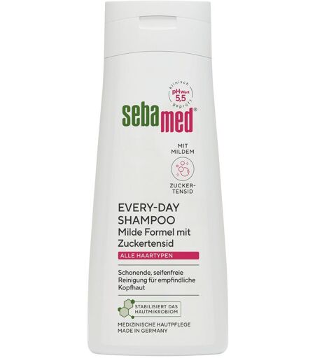 Sebamed Every-Day Shampoo 200 ml Haarshampoo für Damen und Herren, schonende, seifenfreie Reinigung für empfindliche Kopfhaut, besonders mild durch Zuckertensidformel, für alle Haartypen geeignetFÜR DIE TÄGLICHE HAARWÄSCHE: Besonders milde Reinigung für die täglicheHaarwäsche – dank besonders sanfter, waschaktiver Zuckertenside. Die speziellentwickelte Tensid-Kombination reinigt schonend und hilft, Haar und Kopfhaut vorAustrocknung zu schützen. Das Haar erhält mehr duftige Fülle und seidigen GlanzFÜR GESUNDE HAUT: Der pH-Wert 5,5 von sebamed stärkt die Funktion desnatürlichen Hautschutzmantels auch gegen schädliche Umwelteinflüsse und trägt zurGesunderhaltung der Haut beiSTABLISIERT DAS HAUTMIKROBIOM: Die Mikroorganismen der Haut leben ineinem gut eingespielten ökologischen Gleichgewicht. Sebamed Produkte mit ihrenschonenden Rezepturen, milden Inhaltsstoffen und dem pH-Wert 5,5 helfen, dieArtenvielfalt und Vitalität dieses hauteigenen Ökosystems auf natürliche Weise zuerhalten und zu stabilisierenQUALITÄT MADE IN GERMANY: Unsere Produkte werden in Deutschlandentwickelt, getestet und hergestellt. Die Qualität ist durch ausgewählte Rohstoffe undkontrollierte Fertigungsprozesse garantiert. Sebamed Produkte sind in über 400Studien dermatologisch-klinisch getestetDERMATOLOGISCH-KLINISCH BESTÄTIGT: Sebamed Produkte helfen, dennatürlichen Hautschutzmantel zu stabilisieren und die Haut widerstandsfähiger gegenUmweltreize zu machen. Die Verträglichkeit und Pflegewirkung sind dermatologisch-klinisch geprüft und bestätigt. Dadurch trägt diese Pflegeserie nachweislich dazu bei,das Risiko für Hautreaktionen spürbar zu vermindernUNSER UMWELTVERSPRECHEN: 0 % Mikroplastik 0 % Silikone 0 % PEG, VEGANAnwendung:Shampoo in der Handinnenfläche aufschäumen und unter leichtem Massieren aufdie Kopfhaut auftragen. Ausspülen. Für die tägliche Anwendung geeignet.Inhaltsstoffe:Aqua, Decyl Glucoside, Disodium Laureth Sulfosuccinate, Sodium LaurylSulfoacetate, PEG-55 Propylene Glycol Oleate, Propylene Glycol, Parfum,Phenoxyethanol, Sodium Benzoate, Citric Acid, Hydroxypropyl Oxidized Starch PG-Trimonium Chloride, Lactic Acid, Sodium Chloride, Sodium Lactate ...