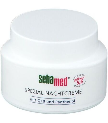 Die Haut wird mit den Jahren immer anspruchsvoller und empfindlicher.Die Pflegewirkstoffe von sebamed Spezial Nachtcreme mit Q10 unterstützen die hauteigenen Regenerationsprozesse, die vor allem über Nacht ablaufen. Q10 ist ein hauteigener Faktor, der für den aktiven Stoffwechsel der Zellen benötigt wird, dessen Produktion in der Haut schon ab 30 Jahren abnimmt. Panthenol unterstützt die Regenerationsprozesse der Hautzellen. Vitamin E neutralisiert freie Radikale und mildert Fältchen. Süßmandelöl und Sheabutter glätten die Haut und schützen vor Austrocknung. Phytosterole aus Rapssamen wirken hautberuhigend und feuchtigkeitsspendend. Der pH-Wert 5,5 stabilisiert den Säureschutzmantel der Haut und unterstützt ihre Barrierefunktion. Ingredients:Aqua, C12-15 Alkyl Benzoate, Glyceryl Stearate SE, Prunus amygdalus dulcis oil, Cetearyl Alcohol, Sorbitol, Butyrospermum parkii butter, Brassica campestris Sterols, Squalane, Tocopheryl Acetate, Behenyl Alcohol, Panthenol, Ubiquinone, Cetearyl Glucoside, Xanthan Gum, Sodium Citrate, Parfum, Benzyl Alcohol, Phenoxyethanol. ...