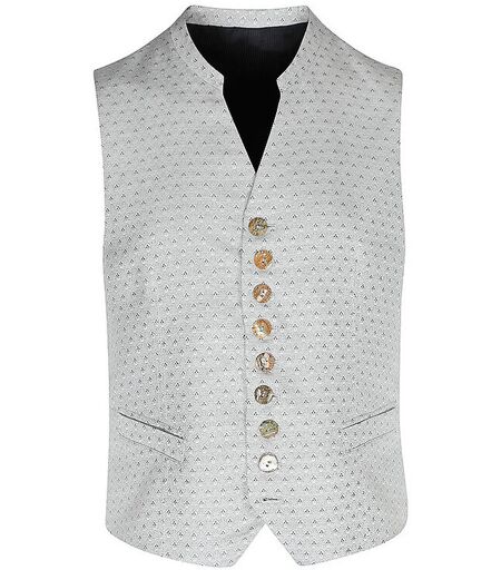 Herren Trachtengilet aus hochwertigem Jacquard Strucktur V-Ausschnitt Perlmutt Knöpfe Rückenteil mit Band zum regulieren Schimmerndes Allover Muster Stretchfutter Gerade Passform Seitlich mit Paspeltaschen Farbbezeichnung: Weiss Natur Material: 53% Polyester, 25% Baumwolle, 22% Leinen Futter: 50% Viskose, 50% Cupro ...