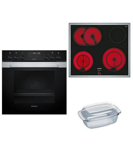 Beim Kauf dieses Produktes erhalten Sie nach erfolgreicher Registrierung € 100 Cashback von Siemens. Produkt-Highlight Herd: cookControl30:: Automatikprogramme garantieren beste Ergebnisse; 3D Heißluft:: gleichmäßige Hitze auf bis zu drei Ebenen. Für exzellente Ergebnisse; Backwagen mit Soft-Einzug:: mehr Sicherheit und Bedienkomfort durch den Backwagen mit Soft-Einzug und in der Tür eingehängten Rosten und Blechen; humidClean:: schnelle Reinigung von Verschmutzungen in deinem Backofen; Produkt-Highlights Kochfeld:: Zuschaltbare Bräterzone:: Platz für große Bräter und Pfannen; Drehwähler:: Bedienung der Kochzonen über die Drehwähler am Einbau-Herd; Zweikreiszonen 18, 21 cm und Bratzone:: Platz für große Pfannen und Töpfe; Inkl. kostenlosem Glasbräter mit 5,4 L aus Borosilikatglas: Elektrischer AnschlußAngaben nach 2010/30/EU; Energieeffizienzklasse A+; Spektrum [A+++ bis D]; Energieeffizienzindex: 81,2; Anschlusswert: 11,4 kW; 220-240V 50/60Hz Netzanschluss; 3x16 A Absicherung; Kombination Einbauherd+Glaskeramikfeld; Leistungseigensch. Backofen (allgemein)Backrohrvolumen: Large; 0,94 kWh Energieverbr. b. Ober-+Unterhitze; 0,69 kWh Energieverbr. b. Heißluft/Umluft; Bedienungversenkbare Schalter; 4 Kochzonenregler; Drehregler für Kochzonen; Drehregler für Backofen-Funktionswahl; Drehregler für Backofen-Temperatur; LCD-Anzeige; gradgenaue Temperaturregelung; min. Gradzahl d. Temperaturanzeige: 30 °C; max. Gradzahl d. Temperaturanzeige: 275 °C; Elektronik-Uhr; Start-Vorwahl; Abschaltautomatik für Backofen; Aufheiz-Kontrollanzeige; Funktionsverrieglung/Kindersicherung; Backofen-Funktionen9 Betriebsarten; 30 Automatik-Progr., gesamt; Ober-/Unterhitze; 3D-Heißluft; Heißluft sanft; Unterhitze; Grill; Umluft-Grillen; Pizza-Stufe; Niedertemperaturgaren; Automatik-Programme; Schnellvorheizen-Funktion; Tiefkühlgerichte; Backofen-AusstattungRestwärmeanzeige; Backwagen; Aufnahmegitter für Backbleche; Anz. der Einschubhöhen: 5; Innenraum-Halogen-Beleuchtung; Innenraum-Beleuchtung separat schaltbar; 1 Backofen-Lampe(n); Hydrolyse; pyrolytische Selbstreinigung; Dampf-Reinigungssystem; Glatt-Email-Innenbeschichtung; Backofentür-Verriegelung; Anzahl der Innenräume: 1; Innenraum-Volumen: 71 l; Innenraum-Breite: 48 cm; Innenraum-Höhe: 35,7 cm; Innenraum-Tiefe: 41,5 cm; Kühlgebläse zur Schrankentlüftung; Zubehöremaillierte Backbleche; 1 Backblech(e); Kombi Back-/Grillrost; Universalpfanne; Gehäuse-EigenschaftenBreite: 59,4 cm; Höhe: 59,5 cm; Tiefe: 54,8 cm; Tiefe bei geöffneter Tür: 104 cm; Gewicht: 40,4 kg; Kühle Front; 4 Backofen-Türscheibe(n); Backofentür mit Sichtfenster; Backofentür-Innenfläche ganz aus Glas; Nischen-Breite: 56 cm; Nischen-Höhe: 60,4 cm; Nischen-Tiefe: 55 cm; Ausstattung GlaskeramikfeldElektro-Anschlusswert: 7,8 kW; 4 Kochzone(n); Energieverbrauch der Kochmulde 193,3 Wh/kg; Anzeige vorn im Kochfeld; Kochzonen-Erweiterung separat schaltbar; Restwärmeanzeige für jede Kochzone; Sicherheitsabschaltung; Kochzone-vorne/außen linksBlitz-Kochzone vorne... ...