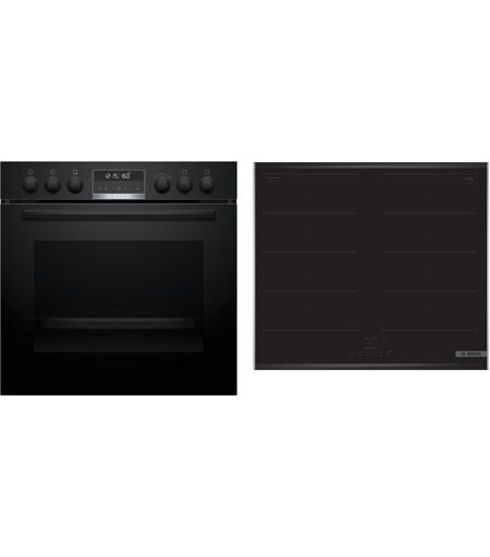 Das Herdset Bosch HND677LS62 besteht aus dem Einbau-Herd HEG578BB4 und dem Elektro-Kochfeld NVQ645CB6E. Der Herd überzeugt mit einem Backraumvolumen von 71 Litern und stellt zehn Heizarten und 30 Automatikprogramme zum Kochen, Backen und Garen zur Verfügung. Mit der Schnellaufheizung kommt man schnell zur Zieltemperatur ohne höheren Energieverbrauch und die 3D-Heißluft sorgt für perfekte Backergebnisse auf bis zu drei Ebenen gleichzeitig dank optimaler Wärmeverteilung. Über das weiße LED-Display gestaltet sich die Bedienung besonders einfach dank direktem Zugriff auf Zusatzfunktionen, Temperaturempfehlung und Temperaturanzeige. Die Pyrolyse-Selbstreinigung Reinigt den Garraum automatisch, sodass nur noch die Asche entfernt werden muss. Das Kochfeld des HND677LS62 verfügt über vier Induktions-Kochzonen und stellt 17 Leistungsstufen sowie eine PowerBoost-Funktion für alle Kochzonen zur Verfügung. Bei Verwendung von größerem Kochgeschirr zwei Kochzonen zu einer größeren verbunden (CombiZone). Die Restwärmeanzeige für jede Kochzone zeigt an, welche Kochzonen noch heiß sind, zudem ist eine Kindersicherung sowie eine Sicherheitsabschaltung vorhanden. Der Herd des HND677LS62 überzeugt in puncto Sicherheit mit einer geringen Türtemperatur, einer Kindersicherung, einem Kühlgebläse und einer Restwärmeanzeige. ...