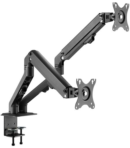 Der Easy Flex Dual 17 - 27“ ist eine vollbewegliche Monitor-Tischhalterung für Monitore mit 43 - 68 cm (17 - 27“) Bildschirmdiagonale. Die Konstruktion aus hochwertigem und langlebigem Aluminium ist vollbeweglich und durch den extrem leichtgängigen Federzylinder besonders leicht zu bedienen. Monitore lassen sich dadurch mühelos in jede gewünschte Position bringen. Die Kabel der verbauten Komponenten können entlang der Schwenkarme verlegt und mit Clips sauber fixiert werden. Tischplattenstärken können dabei von mindestens 10 bis maximal 80 mm berücksichtigt werden. Die Traglast der Halterung ist für ein Gewicht zwischen 2 und 7 kg optimiert. Die Halterung passt sich automatisch dem Gerätegewicht an, sodass keinerlei Einstellung mehr nötig ist. Die Oberfläche ist mit einer schlag- und kratzfesten Pulverbeschichtung in schwarz veredelt ...