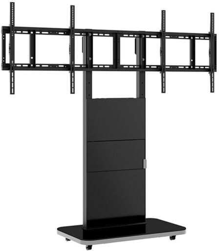 Der Pro-Tower M Dual ist ein mobiles Standsystem, welches sich für zwei Bildschirme mit einer Größe von 46 – 55” (117 - 140 cm) nebeneinander eignet. Die VESA-Aufnahmen können in Landscape-Ausrichtung von min. 200 x 200 mm - max. 600 x 400 mm bestückt werden. Wahlweise ist die VESA-Aufnahme in zwei Höhen montierbar und verfügt über eine montageseitige Neigungseinstellung. Die Stromzuführung ist innenliegend im Standsystem untergebracht. Die rückseitige Abdeckung ist revisionierbar und bietet eine Montagemöglichkeit für z. B. einen Mini-PC. Leichtlaufende Schwerlastrollen mit Feststellbremse sorgen einerseits für die nötige Mobilität und andererseits für einen sicheren Stand. Griffe an der Rückseite sorgen beim Standortwechsel für einen stabilen Griffpunkt, welcher das schieben und ziehen des gesamten Systems vereinfacht. Die maximale Traglast beträgt 80 kg (2x 40 kg). ...