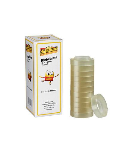 office discount Klebefilm: gut und günstigDafür ist unsere Hausmarke bekannt und wird sehr gerne gekauft. Der transparente Klebefilm aus Polypropylen (PP) hält hervorragend und ist unsichtbar! Absolut hohe Reißfestigkeit und eine gute Alterungsbeständigkeit zeichnen diesen Klebefilm aus. Deshalb ist der office discount Klebefilm eine top Wahl für Schule, Arbeitsplatz oder Haushalt. Gut, wenn dieser Klebefilm immer schnell zur Hand ist.Wir liefern Ihnen den Klebefilm im Pack mit 12 RollenWarum also mehr bezahlen, wenn es auch einen zuverlässigen preiswerten Klebefilm gibt! Testen Sie den Klebefilm von office discount und bestellen Sie ihn jetzt in unserem Online-Shop. Sie werden zu 100% zufrieden sein. ...