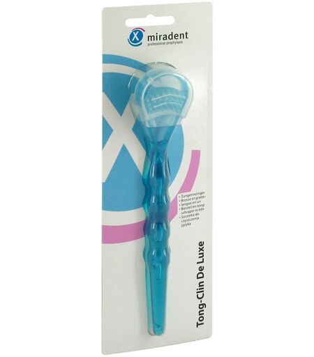 Anwendungsgebiet von Miradent Zungenreiniger Tong‐Clin De Luxe blau transparentMiradent Zungenreiniger Tong‐Clin De Luxe blau transparent für die ideale Unterstützung der Zungenreinigung, entfernt sanft Zungenbeläge dank kurzem Borstenfeld sowie Konkav‐Schaber, mit extra flacher und abgerundeter Form.