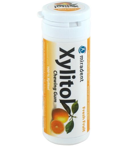 Anwendungsgebiet von Miradent Zahnpflegekaugummi Xylitol Fresh FruitMiradent Zahnpflegekaugummi Xylitol Fresh Fruit reinigen Ihre Zähne und pflegen sie, regelmäßig verzehrt reduzieren sie nachhaltig den Zahnbelag (Plaque) auf den ZähnenWirkungsweise von Miradent Zahnpflegekaugummi Xylitol Fresh FruitZahnärzte empfehlen drei Mal täglich Zähneputzen. Häufig ist das allerdings aus Zeitgründen nicht möglich. Um Ihre Zähne trotzdem optimal vor Karies zu schützen, verwenden Sie Miradent Zahnpflegekaugummi Xylitol Fresh Fruit. Das in Miradent Zahnpflegekaugummi Xylitol Fresh Fruit enthaltene Xylitol verhindert die Plaquebildung und somit auch die Entstehung von Zahnbelägen und Karies. Vorhandener Zahnbelag wird durch Miradent Zahnpflegekaugummi Xylitol Fresh Fruit ebenfalls entfernt. Zudem verbessern Miradent Zahnpflegekaugummi Xylitol Fresh Fruit die Remineralisierung Ihrer Zähne, wirken angenehm kühlend und schmecken lecker nach Pfefferminz. Das enthaltene Xylitol kann weiterhin nicht von den Bakterien verbraucht werden. Dies reduziert ebenfalls die Entstehung von Karies. Insgesamt können Miradent Zahnpflegekaugummi Xylitol Fresh Fruit das Vorkommen von Karies um bis zu 100 % senken. Wirkstoffe / Inhaltsstoffe / ZutatenZutaten von Miradent Zahnpflegekaugummi Xylitol Fresh Fruit: