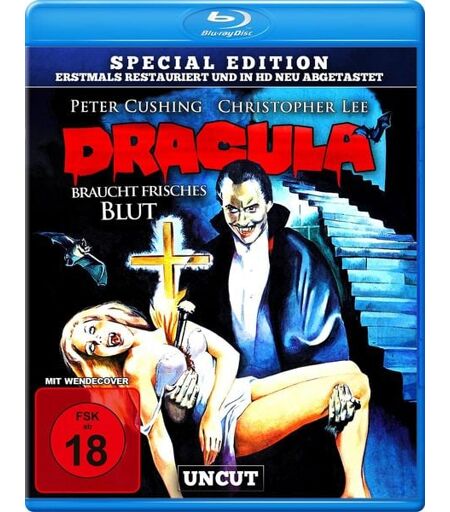 Zu einem der absoluten Grusel-Bestseller DRACULA BRAUCHT FRISCHES BLUT kommt nun endlich eine frisch restaurierte Fassung auf DVD und erstmals in HD neu abgetastet auch auf Blu-ray! So scharf hat man die Weltstars Christopher Lee und Peter Cushing in ihren Paraderollen noch nie gesehen! Ein MUSS für alle Dracula Fans und letztmalig die beiden großen Schauspieler in einem Film! Dazu auch erstmals mit deutschen Untertiteln und Wendecover mit schickem Artwork des US Kinoposters! In einem unscheinbaren Herrenhaus in London werden satanische Riten zelebriert. Doch es handelt sich bei den dunklen Gestalten um die Elite der britischen Gesellschaft. Inspektor Murray (Michael Coles) ruft den legendären Okkultismus-Experten Van Helsing (Peter Cushing) zu Hilfe, der den geheimnisvollen Industriellen D. D. Denham als die Reinkarnation des blutrünstigen Grafen Dracula (Christopher Lee) hält. Und diesmal plant Dracula wahrhaft Ungeheuerliches, denn seine feine Gesellschaft will am Hexensabbat mit Hilfe eines manipulierten Bazillus die gesamte Menschheit durch die Pest ausrotten. Wieder entspinnt sich zwischen Van Helsing und Graf Dracula ein erbitterter Kampf um Leben und Tod! Und nebenbei auch um die komplette Weltbevölkerung... Produziert in den legendären britischen HAMMER STUDIOS! Dieser Film ist Trash pur! Mit seiner Kombination aus altertümlichem Horror und neuzeitlicher Action in Verbindung mit einer Agentenstory war dieses Werk von Drehbuchautor Don Houghton seiner Zeit weit voraus! ...