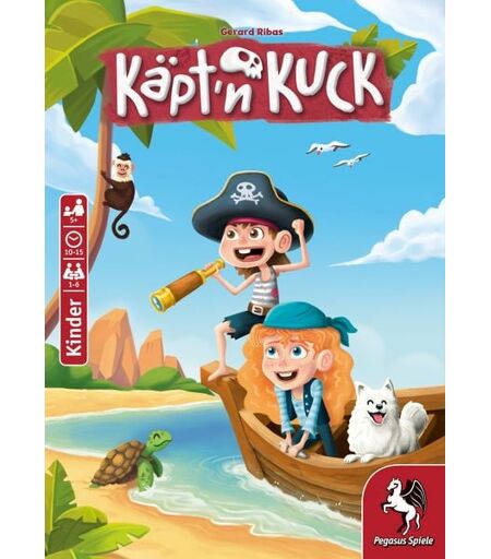 """In dem kooperativen Memo-Spiel Käpt’n Kuck für kleine Schatzsuchende wird zu Spielbeginn eine Schatzinsel-Karte aufgedeckt, die sich alle Spielenden gut einprägen müssen. Die Spielenden gucken danach reihum durch das Fernrohr auf zufällig sortierte Motive. Entscheidet sich die Gruppe dafür, dass das Motiv Teil ihrer Schatzinsel-Karte ist, bewegt sich ihr Boot vorwärts. Doch Vorsicht: Ist eine Piratenflagge zu sehen, greifen die fiesen Piraten an und versuchen in einem Kanonen-Würfelduell das Boot zu kentern. Sobald die Gruppe die Insel erreicht, wird geprüft, ob es die gesuchte Insel ist. Ansonsten haben die Spielenden verloren und müssen es gleich nochmal versuchen …""" ...