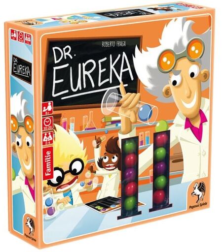 Dr. Eureka Wenn zwei bis vier verrückte Wissenschaftler gleichzeitig nach einer vorgegebenen Formel forschen, herrscht Chaos im Labor. In Dr. Eureka stehen jedem Spieler drei Reagenzgläser gefüllt mit zwei jeweils gleichfarbigen Bällchen zur Verfügung. Sobald eine Formelkarte in die Tischmitte aufgedeckt wird, gilt es, schnell zu sein: Nur wer zuerst durch Umfüllen der Bällchen in seinen Reagenzgläsern die gesuchte Formel mischt, erhält einen Punkt. Fallen einem Spieler jedoch Bällchen herunter oder werden angefasst, scheidet er aus der laufenden Runde aus. Folglich müssen die flinken Formelfinder über viel Fingerspitzengefühl verfügen, um zu punkten. Wem dies zuerst fünf Mal gelingt, gewinnt. Dr. Eureka ist der neue Streich von „Kinderspiel des Jahres“ 2015-Gewinner Roberto Fraga und stellt die Spieler vor einfache Knobeleien, die es dafür umso schneller und mit reichlich Geschick zu lösen gilt. Die richtige Formel für witzig-rasante Spielrunden. Inhalt: 12 Kunststoff-Reagenzgläser 24 Molekülkugeln 54 Formelkarten 1 Anleitung ...