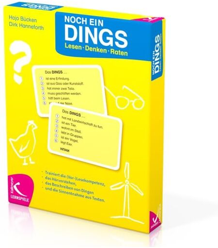 NOCH EIN DINGS ist ein kommunikatives Ratespiel, das (Vor-)Lesen und Zuhören trainiert. Auf einen Blick: Trainiert die (Vor-)Lesekompetenz, das Hörverstehen, das Beschreiben von Dingen und die Sinnentnahme von Texten. Lesen – Denken – Raten NOCH EIN DINGS setzt die Erfolgsreihe DAS DINGS fort. Unzählige Spielerinnen und Spieler der Reihe können bestätigen: Spielspaß und Lernerfolg sind garantiert. Die Spielerinnen und Spieler üben spielerisch und motivierend das (Vor-)Lesen und Zuhören. Denn nur wer gut zuhört und schnell reagiert, vorhandenes Wissen aktiviert und im gesuchten Zusammenhang anwendet, kann bei NOCH EIN DINGS punkten. So geht’s: Die Regeln sind schnell erklärt: Eine Person liest nach und nach die sechs Hinweissätze auf jeder Karte vor. Die anderen raten, welcher Begriff sich hinter den Hinweisen verstecken könnte – so lange, bis das versteckte DINGS gefunden ist. Die zu erratenden Begriffe sind rund um das beliebte Thema Tiere ausgewählt. Das Spiel umfasst die folgenden 15 Kategorien: Afrika Erfindungen Feste Hygiene Kunst Landwirtschaft Märchen Pflanzen Religion Spiele Städte Technik Wasser Weltall Werkzeuge NOCH EIN DINGS kann in vielfältigen unterrichtlichen Kontexten eingesetzt werden: Zum Trainieren der (Vor-)Lesekompetenz und des Hörverstehens im Deutschunterricht, als Warm-up am Beginn einer Unterrichtsstunde, zur Festigung des Wortschatzes am Ende eines bestimmten Themas sowie zur sinnvollen Gestaltung von Vertretungsstunden. ...