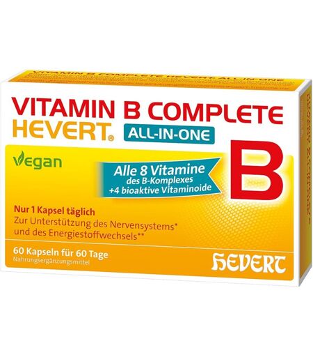 Anwendungsgebiet von Vitamin B Complete Hevert All-in-one KapselnVitamin B Complete Hevert All-in-one Kapseln sind ein Nahrungsergänzungsmittel - Die perfekte Complete-Versorgung mit allen acht B-Vitaminen und 4 bioaktiven Vitaminoiden.„All-in-One“ steht dafür, dass alle acht Vitamine des Vitamin-B-Komplexes, von B1 bis B12, in nur einer Kapsel vereint sind. Diese Vitamine sind unverzichtbar für die normale Funktion und Vitalität des Körpers. Insbesondere Vitamin B6, B12, Folsäure (B9), Niacin (B3) und Pantothensäure (B5) unterstützen die geistige Leistungsfähigkeit und tragen dazu bei, Müdigkeit und Erschöpfung zu reduzieren. Darüber hinaus fördern sie eine normale Funktion des Nervensystems und stärken das Immunsystem, wie beispielsweise Vitamin B6 und B12. Für die Gesundheit von Haut und Schleimhäuten spielen Vitamin B2, Niacin (B3) und Biotin (B7) eine entscheidende Rolle.Einzigartige hochdosierte Kombination Innovative Zusammensetzung Sehr gute Verwertbarkeit durch stoffwechselaktive Vitamine und Vitaminoide Sehr gutes Preis-Leistungsverhältnis und nur 1 Kapsel am Tag Vegan. Laktose-, zucker- und glutenfrei Für Diabetiker geeignetQualität Made in GermanyVom nachhaltigen Familienunternehmen aus dem deutschen MittelstandInnovative ZusammensetzungVitamin B Complete Hevert All-in-one Kapseln vereint alle acht B-Vitamine mit den vier vitaminoidähnlichen Substanzen Cholin, Betain, Inositol und PABA. Obwohl der Körper diese Substanzen selbst produzieren kann, kann in besonderen Lebensphasen wie bei Stress, Krankheit oder intensiver körperlicher Belastung eine zusätzliche Zufuhr hilfreich sein.Die bioaktiven Vitaminoide unterstützen die Wirkung der B-Vitamine und leisten wichtige Beiträge:Cholin unterstützt den Fettstoffwechsel, eine gesunde Leberfunktion und hilft bei der Entgiftung von Homocystein. Betain ist ein essenzieller Methylgruppendonator und fördert die Synthese von Kreatin, Methionin und Carnitin so ...