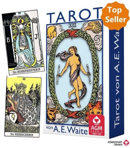 Diese weltweit bekanntesten und beliebtesten Tarotkarten wurden am Anfang des 20. Jahrhunderts von Arthur Edward Waite zusammen mit der Illustratorin Pamela Colman Smith gestaltet. Seitdem sind verschiedene Ausgaben dieses Tarot Kartendecks entstanden, mit etwas voneinander abweichender Farbgebung und unterschiedlichen Rückseiten. Diese Tarot Version in der blauen Faltschachtel hat als Kartenrückseite das Rosenkreuz auf blauem Grund. Sie enthält eine Anleitung à 32 Seiten mit Texten von Rachel Pollack u.a. Es gibt sie in den Formatgrößen Standard, Pocket und Mini. ...