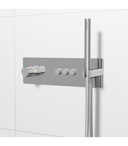 Unterputz-Thermostat ¾″ mit pushtronic Bedienkomfort,mit Mengenregulierung, mit Styropor-Einbaukasten, mit integriertem Schlauchanschluss und Brausehalter sowie einer Metall-Stabhandbrause und Brauseschlauch, 4 Buttons mit unterschiedlichen Symbolen im Lieferumfang enthalten, mit Thermostatkartusche, mit Abdeckplatte 120 mm x 396 mm, matt black Highlight: PUSHTRONIC MIT MENGENREGULIERUNG Von der angenehm weichen Regenbrause zum kräftigen, massierenden Wasserstrahl: Duschliebhaber schätzen das individuelle Wellness-Erlebnis in ihrem Bad. Das Unterputz-Thermostat mit Pushtronic-Bedienkomfort verfügt über eine einfach zu bedienende Mengenregulierung: Durch Drehen des jeweiligen Buttons wird die gewünschte Strahl-Intensität eingestellt. Details: Bitte beachten Sie, dass diese Badarmatur aufgrund des hohen Wasserdurchflusses leider nicht für Durchlauferhitzer geeignet ist. Dieses Produkt besteht aus massivem Messing. Abgerundet mit einer hochwertigen und langlebigen Chrom-Oberfläche für wunderschöne Lichtreflexe. Armatur mit Thermostat für eine Temperaturvoreinstellung und eine angenehme Regulierung der Temperatur. Mit einer integrierten Verbrühschutz-Sicherheitssperre bei 38°C. Zur Unterputzmontage - Technische Komponenten und Anschlüsse sind für ein stylisches Ambiente in der Wand versteckt. Dank des schlichten eckigen Designs fügt sich das Produkt in jedes Badambiente ein. Diese Armatur ermöglicht die Regulierung der Wassermenge. Mit dieser Armatur können Sie bis zu drei Verbraucher ansteuern (z.B. Handbrause, Regenbrause, Wanneneinlauf). Möchten Sie weitere Verbraucher ansteuern benötigen Sie eine Armatur mit mehr Umstellungsmöglichkeiten (z.B. Armatur mit 4-Wege-Umsteller). Technische Details: Durchlauferhitzer: Nicht für Durchlauferhitzer geeignet Material: Messing Farbauswahl: chrom Armaturenart: Thermostat-Armatur Montageart: Unterputzmontage Design: Eckiges Design Mengenregulierung: Mit Mengenregulierung Umstellungsvarianten: Mit 3 Ausgängen weitere Details: UP-Thermostat ¾“ mit pushtronic für 3 Verbraucher,mit Mengenregulierung mit Unterputz-Einbaukörper chrom ...