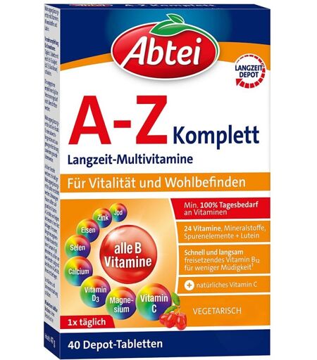 Anwendungsgebiet von Abtei A-Z KomplettAbtei A-Z Komplett ist ein Nahrungsergänzungsmittel mit Vitaminen, Mineralstoffen und Lutein.Eine ausgewogene, vitamin- und mineralstoffreiche Ernährung ist die Grundlage für ein gesundes Leben. Der menschliche Körper kann jedoch viele Nährstoffe nur in begrenzter Menge verwerten. Deshalb verfügt Abtei A-Z Komplett über einen Vitalkern®, der die enthaltenen Nährstoffe aus seinem Langzeit-Depot über mehrere Stunden hinweg an den Körper abgibt. Abtei A-Z Komplett enthält essenzielle Vitamine und Mineralstoffe und deckt mit nur einer Tablette täglich den Tagesbedarf ab: Vitamin B6, B12, Folsäure, Eisen tragen zur Verringerung von Müdigkeit und Erschöpfung beiVitamin A, C und Zink unterstützen das ImmunsystemMagnesium, Niacin und Kupfer unterstützt den Energiestoffwechsel und das NervensystemVitamin A, C und Zink unterstützen das ImmunsystemVitamin B6, B12, Folsäure & Eisen tragen zur Verringerung von Müdigkeit und Erschöpfung beiMagnesium, Niacin und Kupfer unterstützen den Energiestoffwechsel und das NervensystemWirkstoffe / Inhaltsstoffe / ZutatenZutaten von Abtei A-Z Komplett:
