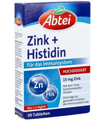 Anwendungsgebiet von Abtei Zink+Histidin Tabletten titandioxidfreiAbtei Zink+Histidin Tabletten titandioxidfrei sind ein Nahrungsergänzungsmittel mit hochdosiertem Zink. Zink gehört zu den lebenswichtigen Spurenelementen und übernimmt im Körper unzählige Funktionen, kann aber vom Körper selbst nicht hergestellt werden. In der kalten Jahreszeit, bei unausgewogener Ernährung und bei besonderer körperlicher Belastung kann es deshalb sinnvoll sein, die Ernährung mit Abtei Zink+Histidin Tabletten titandioxidfrei zu ergänzen, um den Tagesbedarf an Zink zu decken.Wirkstoffe / Inhaltsstoffe / ZutatenZutaten von Abtei Zink+Histidin Tabletten titandioxidfrei: