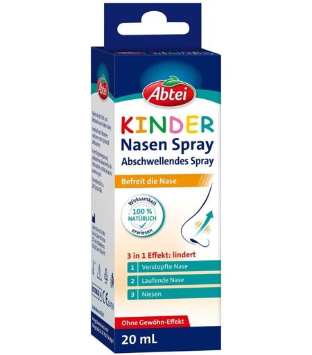 Anwendungsgebiet von Abtei Kinder Nasen SprayMit Abtei Kinder Nasen Spray wird Ihnen eine natürlich wirksame Alternative zu traditionellen, abschwellenden Nasensprays geboten. Dank des 100% reinem und hypertonen Meerwassers schwillt die Nasenschleimhaut ohne Beeinträchtigung in weniger als 2 Minuten wieder ab. Abtei Kinder Nasen Spray zeichnet sich durch eine gute Verträglichkeit aus. Das Produkt befreit die Nase und erleichtert das Atmen, auch während Schlafen oder Essen (Home Use Test unter 60 Kindern, 2021).Wirkstoffe / Inhaltsstoffe / ZutatenAbtei Kinder Nasen Spray enthält: