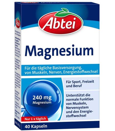 Anwendungsgebiet von Abtei Magnesium 240 Mg Kapseln titandioxidfrei Abtei Magnesium 240 Mg Kapseln titandioxidfrei enthalten die Magnesiumverbindung Magnesiumoxid. Magnesium ist ein wichtiger Mineralstoff, der zu einer normalen Muskelfunktion, Funktion des Nervensystems und zu einem normalen Energiestoffwechsel beiträgt. Insbesondere durch hohe körperliche Belastung im Beruf oder in der Freizeit kann es zu einer Magnesium-Unterversorgung kommen. Da Magnesium von Körper nicht selbst produziert werden kann, muss es von außen zugeführt werden. Dies kann einerseits durch eine ausgewogene Ernährungsweise geschehen oder durch Nahrungsergänzungsmittel, die unterstützend eingenommen werden.Wirkstoffe / Inhaltsstoffe / ZutatenZutaten von Abtei Magnesium 240 Mg Kapseln titandioxidfrei :