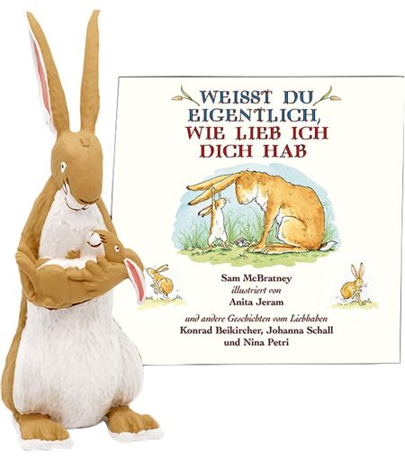 Die beliebte Geschichte von Sam McBratney als Hörbuch mit Liedern für Kinder ab 3 Jahren. Tonie Hörfigur von tonies Reihe: Weißt du eigentlich wie lieb ich dich hab? Titel: Weißt du eigentlich wie lieb ich dich hab? Laufzeit: ca. 35 Min. technische Details: magnethaftend, handbemalt, integrierter NFC-Chip, Material: Kunststoff Lieferumfang: Hörfigur, Booklet/Bedienungsanleitung geeignet ab 3 Jahren Die Geschichte vom kleinen Hasen, der ganz sichergehen will, dass der große Hase auch weiß, wie sehr er ihn lieb hat, ist eine Geschichte, die viele Eltern und Kinder bereits in ihr Herz geschlossen haben. Auf diesem Tonie findet ihr zusätzlich noch Lieder und weitere Geschichten von Anita Jeram. Tonies sind Hörfiguren für die Toniebox. Sie machen Hören anfassbar, denn mit ihnen bedient man die Toniebox. Man kann sie aber auch sammeln und mit ihnen spielen. Um der Geschichte zu lauschen, stellt man die Hörfigur einfach auf die Toniebox. Hinweise Die Toniebox ist nicht im Lieferumfang enthalten – bitte separat bestellen. Bitte beachten: Eine Rückgabe ist nur mit ungeöffneter Originalverpackung möglich. Wir bitten um Dein Verständnis. ...