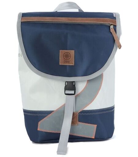360° Taschen Landgang Mini Rucksack Segel weiß / Balken Blau, Zahl hellgrau, Gurt grau