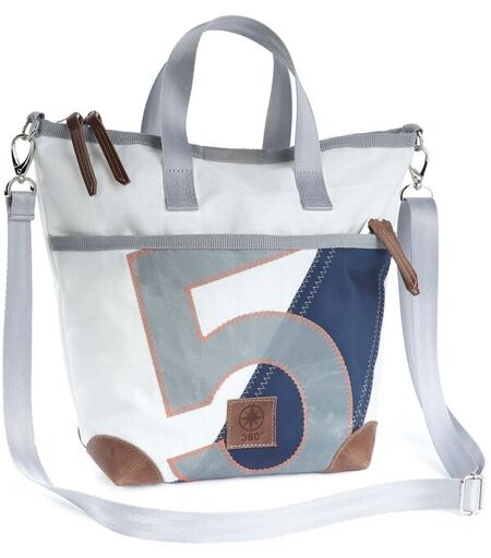 360° Taschen Deern Mini Schultertasche weiß / blau, Zahl hellgrau, Gurt grau mit Karabinern
