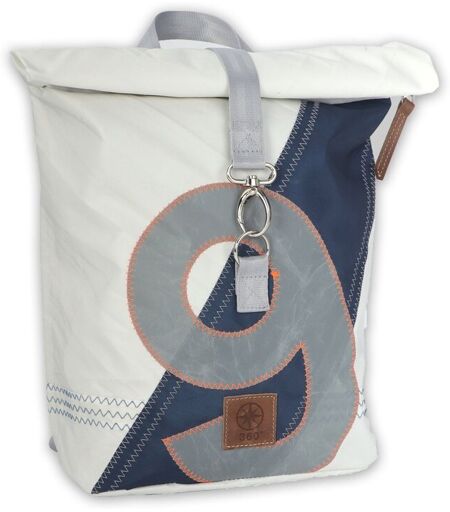 360° Taschen Möwe Rucksack weiß / blauer Streifen, Zahl hellgrau, Gurt grau
