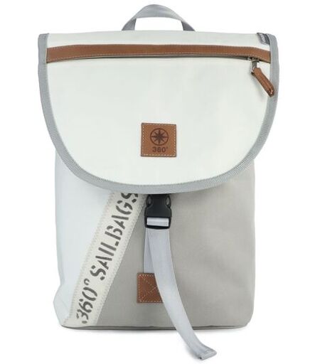 360° Taschen Landgang Mini Rucksack weiß / Persenning grau, Stencil Aufschrift, Gurt grau