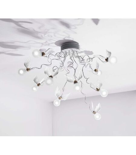 Wie ein Schwarm Vögel kommt einem die Komposition der Ingo Maurer Birdie's Nest LED Deckenleuchte mit Ihren 10 Armen vor. Die Birdie Serie wurde 2002 entworfen und geniest seitdem einen stetig wachsenden Bekanntheitsgrad, nun ist sie auch mit neuster LED-Technolgie erhältlich. Nicht zuletzt am hohen Wiedererkennungswert liegt der stetig wachsende Bekanntheitsgrad der kleinen Birdies, denn an jeder Leuchtmittelfassung befinden sich handgefertigte Flügel aus Gänsefedern welche der Birdies Serie Ihren Namen und ihr einzigartiges Aussehen verschaffen. Befestigt ist jede Fassung an einem dünnen Drahtarm, welcher serparat frei nach Lust und Laune gebogen werden kann - so ist der Fantasie bei der Ausrichtung der Ingo Maurer Birdie's Nest LED Deckenleuchte kaum Grenzen gesetzt und Sie können jede Leuchte ganz nach Lust und Geschmack anordnen. Die Kabel sind beim Birdie's... ...