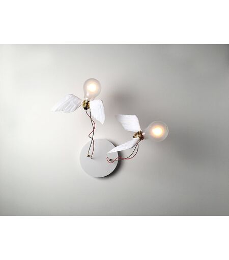Die Ingo Maurer Lucellino Doppio LED Wandleuchte / Deckenleuchte ist Teil der Lucellino Serie, welche 1992 entworfen wurde und seither einen stetig wachsenden Bekanntheitsgrad geniest. An der Leuchtmittelfassung aus hochwertigem Messing befinden sich handgefertigte Flügel aus Gänsefedern welche der Lucellino Serie ihren hohen Wiedererkennungswert sowie auch Ihren Namen (Luce = Licht, Uccellino = Vögelchen) verschaffen. Durch die stetige umstellung von Halogen auf LED ist die Lucellino Doppia Wandleuchte nun auch mit einem LED-Leuchtmittel erhältlich, welches energieeffizienter ist. Befestigt ist jede Fassung an einem dünnen Drahtarm, welcher frei nach Lust und Laune gebogen werden kann. Das Kabel ist bei der Ingo Maurer Lucellino Doppio LED Wandleuchte / Deckenleuchte im Kontrast dazu rot. Die Lucellino Doppio LED ist extern über Schalter oder Dimmer in der Wand regelbar.... ...