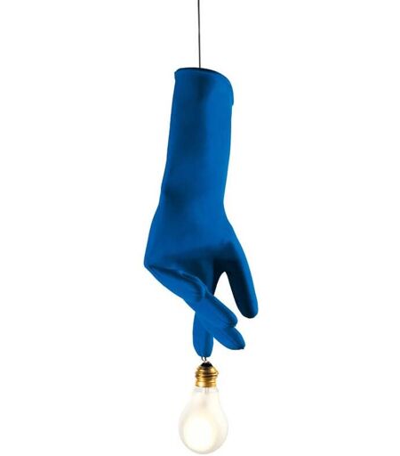Die Ingo Maurer Luzy Pendelleuchte besteht aus einem blauen oder schwarzen Gummihandschuh mit einer matten Glühbirne an der Spitze des Zeigefingers. Das Design ist überraschend und ungewöhnlich, frei von gestalterischen Zwängen und der Langeweile des immer Gleichen. Die Inspiration stammte davon, als Ingo Maurer mehrere solcher blauen Handwerkerhandschuhe in einer alten Fabrik sah. Das Bild ließ ihn nicht los. Dann wurde die Luzy gebohren, kontrovers und ein klares Statement zugleich. „Ist das ernst?“, werden sich einige wundern. Ja, und es tut gut! Die blauen Handschuhe der Ingo Maurer Luzy Pendelleuchten werden in aufwendiger Handarbeit, in mehreren Schichten bemalt. Zurück bleibt ein klares Statement, die sich durch Farbe und Form von anderen Dingen abheben. Ein Must-Have für Kunst- und Ingo-Maurer-Liebhaber. Sie finden weitere Produkte des erfolgreichen deutschen Herstellers Ingo Mau... ...